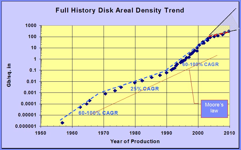 On the face of it there looks to have been four distinct phases. Starting back in 1958 with IBM’s invention of the Hard Disk increases in areal density were fairly easy to come by. You could almost see the tracks on the platter! Since users up till then had been used to tape and punched tape or cards, a ‘truely’ random access device, with seemingly huge (5MB) amounts of capacity was amazing. People were quickly hooked and the Hard Disk ‘drug’ sales continued unabated. Twice as much next year for half the cost, we’ll have some of that please.