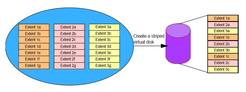 Here is a picture I drew several years ago to help explain. The orange, pink and yellow are the physical resources, the purple is the logical, virtual disk.
