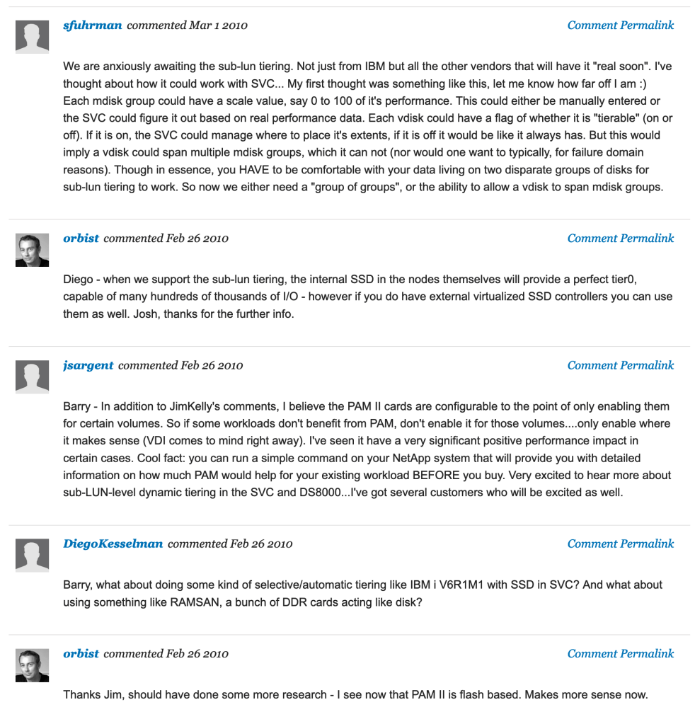 Back to the real point, SSDs are here, they are a step between DDR and HDD, but are still expensive, so we do need to tier, we do need to decide what data needs to be placed where, which is why IBM’s enterprise storage products will be providing the necessary sub-lun level dynamic tiering functions, namely in the DS8000 and SVC products in 2010.