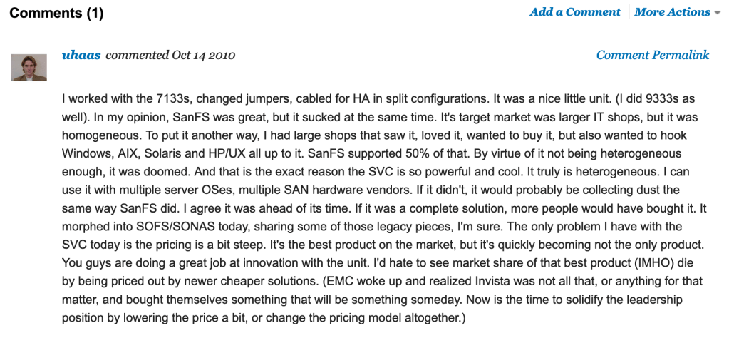 IBM was looking for “new horizon” projects to fund at the time, and three such projects were proposed and created the “Storage Software Group”. Those three projects became know externally as TPC, (TotalStorage Productivity Center), SanFS (SAN FileSystem – oh how this was just 5 years too early) and SVC (SAN Volume Controller). The fact that two out of the three of them still exist today is actually pretty good. All of these products came out of research, and its a sad state of affairs when research teams are measured against the percentage of the projects they work on, versus those that turn into revenue generating streams… (but thats for another day)