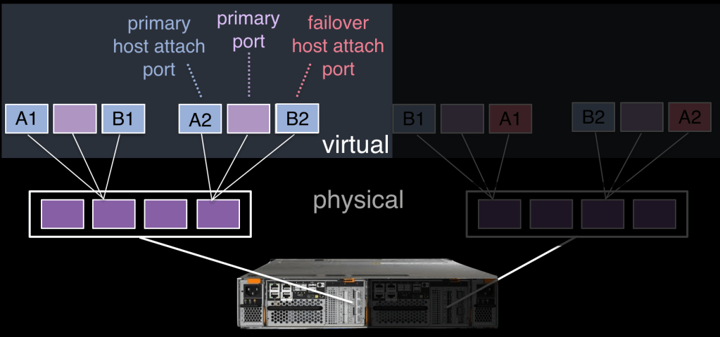 This shows the 3 virtual ports, note that the failover host attach port (in pink) is not active at this time. The second example shows what happens if the second node has failed. Now the failover host attach ports on the remaining node are active and have taken on the WWPN of the failed node’s primary host attach port.