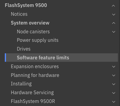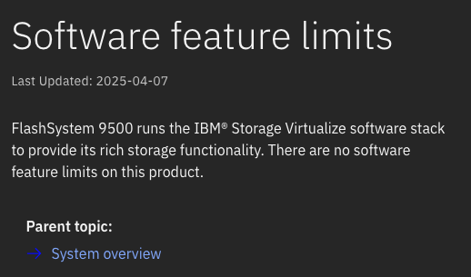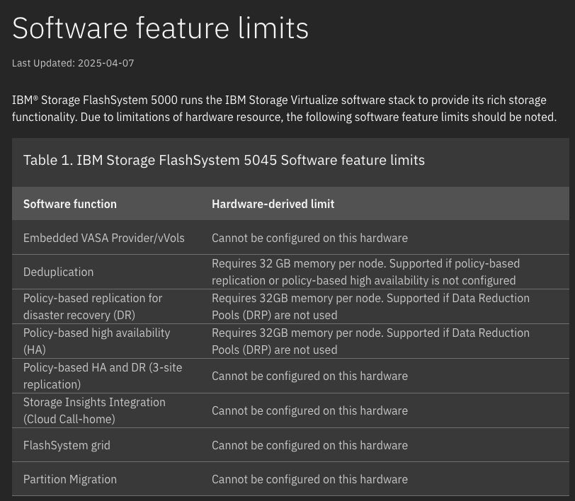 For the chosen product range, 5000, 7000, 9000, SVC etc, the next sections give hardware specific details for your chosen platform. In this example we have selected the FlashSystem 9500, and I am drawing your attention to a very useful page that lists any restrictions, in terms of features and functions that may exist on your chosen platform. If you are lucky enough to have a 9500, then you will see the message in the second image here, but for example, with a 5045 you can see where it has limits (3rd image)