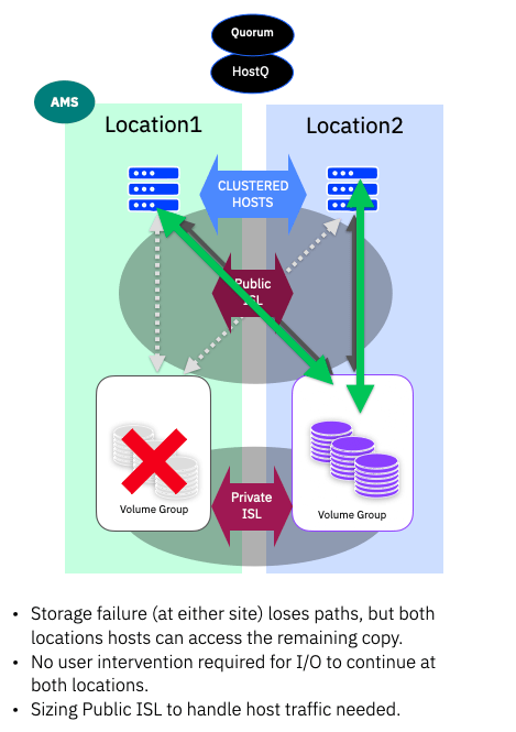 If the two storage systems lose contact with each other, then the IP Quorum is used to validate that both systems are still online. The AMS will be instructed to continue and the other system will take the paths to the volumes in the partition offline. Quorum is assessed on a per HA-partition pair basis, always following which location is the AMS for a given pair. (Unless of course one of the storage systems has of course failed – in that case the remaining system will continue as described in the previous section)