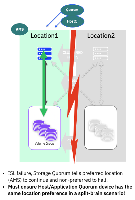 In this situation, because we are running active/active clustered applications or OS, care should be taken to ensure that any preference that can be applied to the “HostQ” witness/quorum device matches the AMS! You want both to make the same decision clearly!