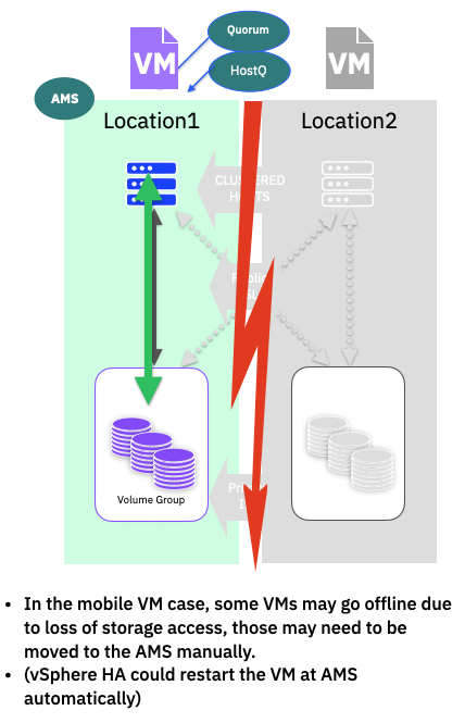 If you are running a clustered hypervisor, where individual VMs could be running at either site, manual movement of any VMs that were running at the non-AMS location may be required. If you are using VMware, with vSphere HA configured then it can be configured to automatically restart the VMs at the AMS.