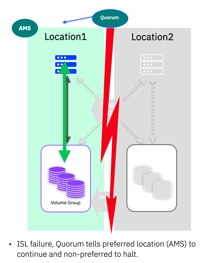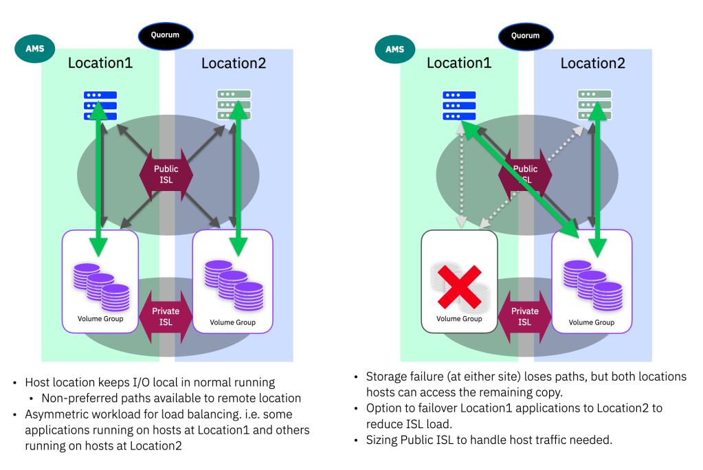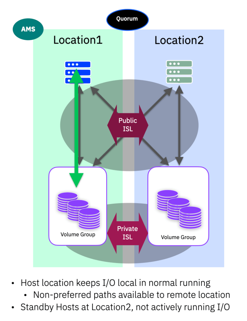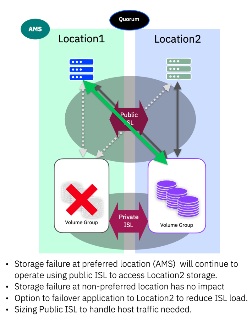 Depending on the Public-ISL bandwidth and the distances involved, some impact to latency should be expected – simply a matter of the speed of light! If this causes a problem, the user can move the application from location1 to location2 and at the same time switch the AMS location to ensure correct site level failure if the ISL links are lost in addition to the storage system.
