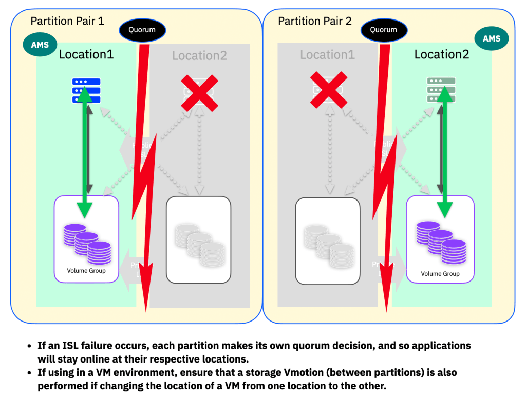 If the two storage systems lose contact with each other, then the IP Quorum is used to validate that both systems are still online. The AMS will be instructed to continue and the other system will take the paths to the volumes in the partition offline. Quorum is assessed on a per HA-partition pair basis, always following which location is the AMS for a given pair. (Unless of course one of the storage systems has of course failed – in that case the remaining system will continue as described in the previous section)
